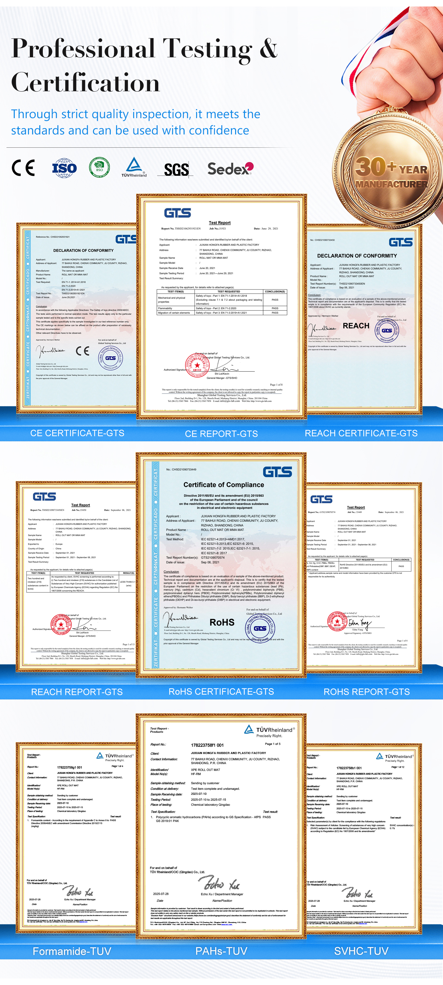 Our factory has BSCI audit and ISO9001 certificate from UKAS.Our products have certificates such as CE,REACH,UKCA,TUV GS,EU 2015/2115,ROHS,Impact Attenuation Test,Fire Proof Certificate,ASTMF963,CPSIA,CAPROP 65,er al.