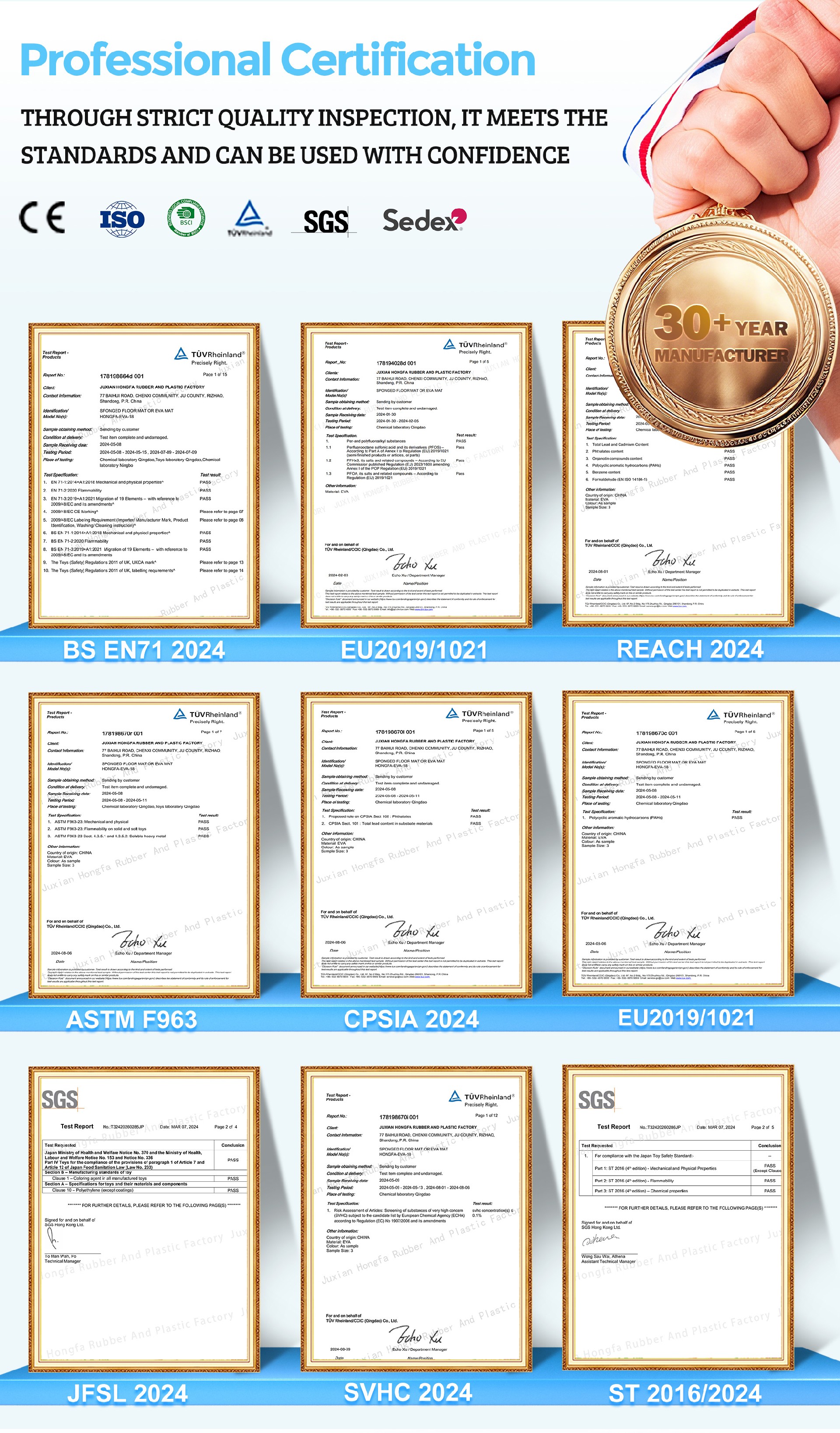 Our factory has BSCI audit and ISO9001 certificate from UKAS.Our products have certificates such as CE,REACH,UKCA,TUV GS,EU 2015/2115,ROHS,Impact Attenuation Test,Fire Proof Certificate,ASTMF963,CPSIA,CAPROP 65,er al.